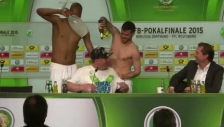 Ονειρεμένο φινάλε της σεζόν για τη Βόλφσμπουργκ και τον Βιεϊρίνια που πανηγύρισε αλά γερμανικά την κατάκτηση του Κυπέλλου. Έτσι μόλις ο προπονητής του Ντίτερ Χέκινγκ ετοιμαζόταν να κάνει δηλώσεις αυτός και ο Νάλντο τον έλουσαν με μπίρα.