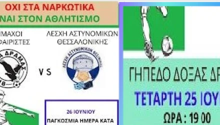 H Λέσχη Αστυνομικών Θεσσαλονίκης με αφορμή την «Παγκόσμια Ημέρα κατά των Ναρκωτικών και της Παράνομης Διακίνησής τους», προκειμένου να ευαισθητοποιήσει την κοινή γνώμη για τις επιπτώσεις από τη χρήση των ναρκωτικών ουσιών και την παράνομη διακίνησή την 25 Ιουνίου 2025 και ώρα 19.00 στο γήπεδο της Δόξα Δράμας θα πραγματοποιήσει φιλικό αγώνα ποδοσφαίρου μεταξύ των Παλαιμάχων της Δόξα Δράμας και της ομάδας της Λέσχης Αστυνομικών Θεσσαλονίκης.