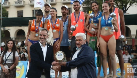 Τα ασημένια μετάλλια στις φιναλίστ του Thessaloniki Juniors Open Κυριακή Κουκουδίτσκα, Κατερίνα Λιόφτη έδωσαν ο πρόεδρος της Ε.ΠΕ.Σ.Θ. Νίκος Δατσέρης και ο υπεύθυνος του μπιτς βόλεϊ της Ε.ΠΕ.Σ.Θ. Γιώργος Γεωργιάδης.