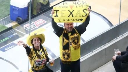 Παρόλα αυτά, την «παράσταση» «έκλεψαν» δύο οπαδοί της ΑΕΚ οι οποίοι, όπως έγραφαν και στο πλακάτ τους, ήρθαν από το Τέξας φορώντας και τα αντίστοιχα καπέλα.