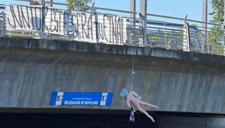 ⚠️ 𝐀𝐓𝐄𝐍𝐂𝐈𝐎́𝐍 | Cuelgan un muñeco en un puente con la bufanda del Sevilla y el siguiente mensaje: