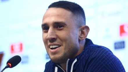 Για το αν υπάρχει πίεση: "Το κλίμα είναι πολύ καλό, θα είναι ένα δύσκολο ματς, πιστεύουμε στον εαυτό μας, έχουμε δείξει τι μπορούμε να κάνουμε. Χαρά θα έλεγα νιώθουμε, χαρά που θα παίξουμε σε γεμάτο γήπεδο και θέλουμε να κερδίσουμε".