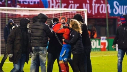 Οι οπαδοί της γηπεδούχου ομάδας «μπούκαραν» στο τέλος της αναμέτρησης στον αγωνιστικό χώρο και την «έπεσαν» στον γιο του Χένρικ Λάρσον, Τζόρνταν.