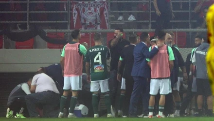 Ακολούθως οι παίκτες του Παναθηναϊκού κατευθύνθηκαν στα αποδυτήρια με τον αγώνα να διακόπτεται προσωρινά, ενώ ο αμυντικός των ''πρασίνων'' αποχώρησε με φορείο από τον αγωνιστικό χώρο.
