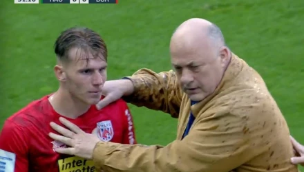 Οι δύο παίκτες είχαν έναν διαπληκτισμό, με τον ισχυρό άντρα του Βόλου, Αχιλλέα Μπέο, που μπήκε στον αγωνιστικό χώρο για να τους χωρίσει να δέχεται νερό από τις εξέδρες.
