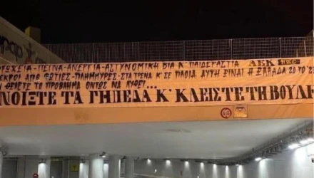 «Φτώχεια-πείνα-ανεργία-αστυνομική βία και παιδεραστία. Νεκροί από φωτιές-πλημμύρες-στα τρένα και σε πλοία, αυτή είναι η Ελλάδα 2.0 το ’23. Αν θέλετε το πρόβλημα όντως να λυθεί, ανοίξτε τα γήπεδα, κλείστε τη Βουλή!», αναφέρει χαρακτηριστικά το πανό.