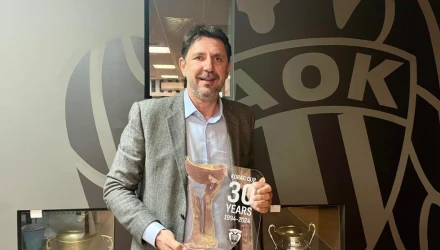 Με την ιδιότητα του Γενικού Διευθυντή του ΕΣΑΚΕ μας επισκέφθηκε σήμερα το μεσημέρι και με την ευκαιρία της παρουσίας του στο PAOK Sports Arena, παρέλαβε την τιμητική πλακέτα για τα 30 χρόνια από την κατάκτηση του Κυπέλλου Κόρατς. Ήταν στη δεκάδα που παρατάχθηκε στην Τεργέστη, και μπορεί να μην αγωνίστηκε, αλλά του έμειναν εμπειρίες για μία ολόκληρη ζωή.