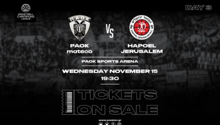 Πιο συγκεκριμένα, σύμφωνα με την επίσημη ανακοίνωση: « Η ΚΑΕ ΠΑΟΚ mateco ανακοινώνει ότι ξεκίνησε η διάθεση των εισιτηρίων για τον αγώνα ΠΑΟΚ mateco – Hapoel Bank Yahav Jerusalem, που θα διεξαχθεί στο PAOK Sports Arena, την Τετάρτη 15 Νοεμβρίου 2023, στις 19:30, για την 3η αγωνιστική του Basketball Champions League.