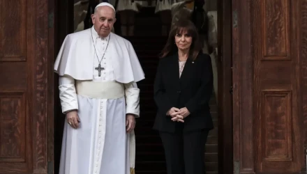Σε εξέλιξη βρίσκονται οι ομιλίες της Προέδρου της Δημοκρατίας και του Πάπα Φραγκίσκου, στη μεγάλη αίθουσα των δείπνων.