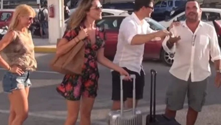 Η κάμερα τους τσάκωσε λίγη ώρα πριν αναχωρήσουν από το αεροδρόμιο του νησιού, όπου τους μετέφερε με αυτοκίνητο φιλικό τους ζευγάρι και έγινε μάρτυρας της παρ’ ολίγον παρεξήγησης του Έλληνα σταρ με τους φωτογράφους του νησιού.