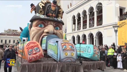 Το πρωτότυπο άρμα που έκανε την εμφάνισή του στη Μεγάλη Παρέλαση της Πάτρας, που λαμβάνει χώρα στην Πλατεία Γεωργίου, απεικονίζει το στόμα ενός τραπεζίτη που καταπίνει το σιδηροδρομικό δίκτυο, ένα πρόβλημα που έχει ταλαιπωρήσει ιδιαίτερα τους κατοίκους.