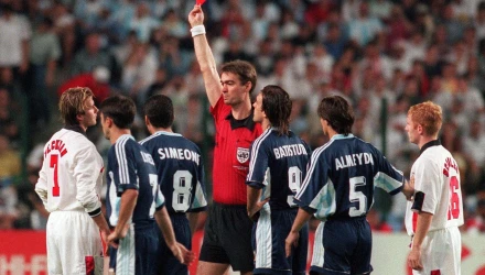 Μερικά παιχνίδια αργότερα, για τους 16 της διοργάνωσης, ο Μπέκαμ δέχθηκε κόκκινη κάρτα στον αγώνα της Αγγλίας με την Αργεντινή, για χτύπημα εκτός φάσης στον Ντιέγκο Σιμεόνε, ο οποίος έκανε βήματα προς τα πίσω, πέφτοντας πάνω στο Βρετανό σταρ του ποδοσφαίρου.