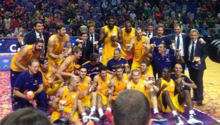 Στράτος Περπέρογλου και Αλέξανδρος Βεζένκοφ πανηγυρίζουν την άνετη κατάκτηση του πρώτου τίτλου στη σεζόν, αφού η Μπαρτσελόνα του Τσάβι Πασκουάλ ήταν ισοπεδωτική στο δεύτερο ημίχρονο του τελικού. Ο Πάου Ρίμπας ήταν εξαιρετικός (15 π., 3 ασ., 3 ριμπ.), αλλά πολύτιμη ήταν και η συνεισφορά του Περπέρογλου (13 π.). Θετική και η παρουσία του Βεζένκοφ που ολοκλήρωσε τον αγώνα με 8 πόντους και 4 ριμπάουντ σε 23' συμμετοχής.