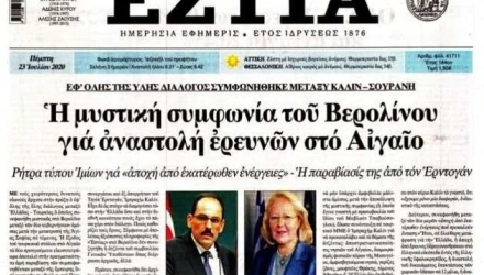 Πρωτοσέλιδο βόμβα από την εφημερίδα «Εστία», η οποία υποστηρίζει ότι για πρώτη φορά ελληνική κυβέρνηση δέχτηκε «εφ' όλης της ύλης διάλογο με την Τουρκία»!