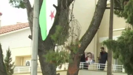 Κατάληψη στην πρεσβεία της Συρίας στο Ψυχικό πραγματοποιούν Σύριοι, οι οποίοι έχουν κρεμάσει τη σημαία της επανάστασης στο μπαλκόνι του κτιρίου.