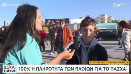 Πιο συγκεκριμένα, στο λιμάνι του Πειραιά βρέθηκε η ρεπόρτερ του ΣΚΑΪ προκειμένου να μιλήσει με τους ταξιδιώτες που αναχώρησαν για τον εορτασμό του Πάσχα. Εκεί η δημοσιογράφος έπεσε πάνω σε έναν πιτσιρικά, ο οποίος πήγαινε με την οικογένειά του στη Σύρο. «Βλέπω ανυπομονείς...», είπε στον μικρό η ρεπόρτερ για να πάρει μια μυθική απάντηση.