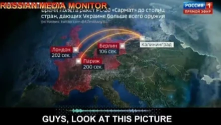 Οι παραγωγοί της εκπομπής έδειξαν στη συνέχεια, στους τηλεθεατές έναν χάρτη που παρουσίαζε πυραύλους να έχουν εκτοξευθεί από το Καλίνινγκραντ, τον ρωσικό θύλακα μεταξύ Πολωνίας, Λιθουανίας και Βαλτικής Θάλασσας. Σύμφωνα με την προσομοίωση, οι πύραυλοι θα μπορούσαν να φτάσουν στο Βερολίνο σε 106 δευτερόλεπτα, στο Παρίσι σε 200 δευτερόλεπτα και στο Λονδίνο σε 202 δευτερόλεπτα.