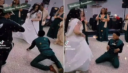Το ζευγάρι παντρεύτηκε στις αρχές Απριλίου και μετά την τελετή, έκαναν είσοδο στη δεξίωση με ένα απίστευτο... σκετσάκι. Ειδικότερα, η λευκή νύφη μπήκε στην αίθουσα κρατώντας ένα λουρί το οποίο ήταν δεμένο στο κολάρο σκύλου που φορούσε ο μαύρος άντρας της. Η μουσική υπόκρουση ήταν το Atomic Dog του George Clinton.
