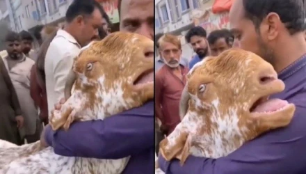 Στο βίντεο που έχει γίνει viral, η κατσίκα έχει αγκαλιάσει τον ιδιοκτήτη της και κλαίει πάνω του, με το πλήθος που είναι συγκεντρωμένο να παρακολουθεί σοκαρισμένο.