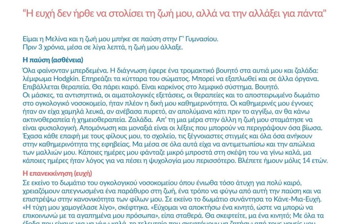 «Σε εκείνο το δωμάτιο του ογκολογικού νοσοκομείου, η τύχη μου χαμογέλασε ξανά» Μελίνα, 17, παιδί ευχής