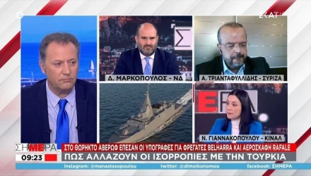 «Καρφιά« και βαρείς χαρακτηρισμούς αντάλλαξαν στην εκπομπή «Σήμερα» του ΣΚΑΪ οι βουλευτές Δημήτρης Μαρκόπουλος και Αλέξανδρος Τριανταφυλλίδης, με αφορμή τα…Rafale.