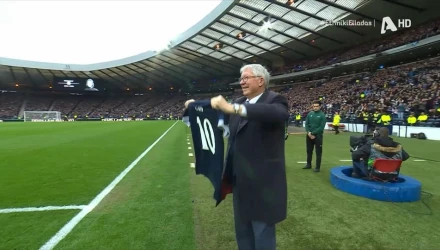 Απίστευτες στιγμές στο Χάμπντεν Παρκ όταν ο Σέρ Αλεξ Φέργκιουσον ύψωσε τη φανέλα του Ντένις Λο πριν την αναμέτρηση της Σκωτίας με την Ελλάδα.