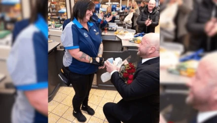 Μια εργαζόμενη σε σούπερ μάρκετ αιφνιδιάστηκε με την πρόταση γάμου που της έκανε ο αγαπημένος της κατά τη διάρκεια μιας πολυάσχολης βάρδιας στο ταμείο. Η Lynne Fuller εξυπηρετούσε στο ταμείο έναν πελάτη σε κατάστημα Aldi στην πόλη Inverness της Σκωτίας, όταν ένας μουσικός έπαιζε γκάιντα και πήγαινε προς το μέρος του. Πίσω του ακολουθούσε ο σύντροφός της Mike Durrant.