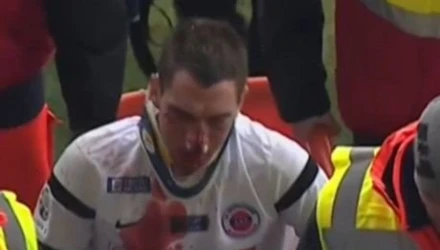 Ο 30χρονος Γάλλος συγκρούστηκε στον αέρα μ' έναν αντίπαλό του και από το ισχυρό χτύπημα που δέχθηκε υπέστη, εκτός από διάσειση, πολλαπλές βλάβες στο πρόσωπο. Μάλιστα θα υποβληθεί σε επέμβαση αποκατάστασης.