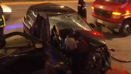 Όπως φαίνεται στο βίντεο, που μετέδωσε το MEGA, ο οδηγός του μαύρου αυτοκίνητου υπό αδιευκρίνιστες συνθήκες έχασε τον έλεγχο και προσέκρουσε με μεγάλη ταχύτητα σε κολώνα φωτισμού, με δεκάδες τμήματα του ΙΧ να εκτοξεύονται στο οδόστρωμα.