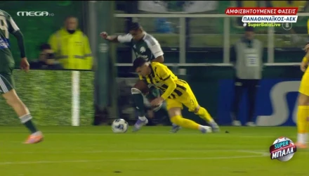 Για τη φάση του πέναλτι του Παναθηναϊκού: «Ήταν αρκετά κοντά, έχουμε πτώση ποδοσφαιριστή του Παναθηναϊκού (πέναλτι 24’). Από τη θέση που ήταν είχε σώματα μπροστά, δεν έδωσε την παράβαση. Ο ποδοσφαιριστής της ΑΕΚ πιάνει από το μπούτι τον παίκτη του Παναθηναϊκού, είναι παράβαση, έγινε χρήση του VAR, είδε την εικόνα και πήρε τη σωστή απόφαση που ήταν πέναλτι για τον Παναθηναϊκό».