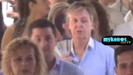 Η κάμερα του «Mykonos Live TV» εντόπισε το ιδρυτικό μέλος των Beatles να περπατάει συνοδευόμενος από τη γυναίκα του και τους άνδρες της προσωπικής του ασφάλειας στα γραφικά σοκάκια της Χώρας του νησιού.