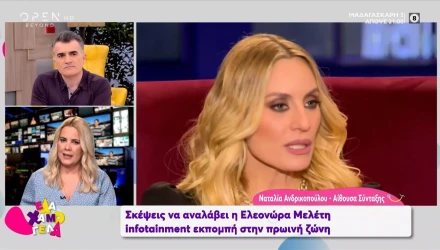 Σκέψεις να αναλάβει η Ελεονώρα Μελέτη infotainment εκπομπή στην πρωινή ζώνη που θα λειτουργήσει ως «γέφυρα» ανάμεσα σε ενημέρωση και ψυχαγωγία ενώ το δεύτερο σενάριο τη θέλει να αναλαμβάνει την αντίστοιχη ζώνη του Σαββατοκύριακου, απέναντι από τον Νίκο Μάνεση. Το τρίτο σενάριο αφορά τη late night ζώνη του καναλιού.