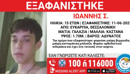 Το «Χαμόγελο του Παιδιού» ενημερώθηκε, στις 19/06/2025, και προχώρησε στη δημοσιοποίηση των στοιχείων του ανήλικου, κατόπιν αιτήματος της οικογένειάς του, καθώς ενδέχεται να συντρέχουν λόγοι που θέτουν τη ζωή του σε κίνδυνο... Ο Ιωάννης Σ. έχει καστανά μαλλιά, γαλανά μάτια, έχει ύψος 1,70 και είναι αδύνατος. Την ημέρα που εξαφανίστηκε φορούσε μαύρη βερμούδα, μαύρη κοντομάνικη μπλούζα, φοράει ορθοδοντικά σιδεράκια και έχει ένα τατουάζ στον αυχένα. Οποιοσδήποτε έχει κάποια πληροφορία, παρακαλείται να επικοινωνήσει τηλεφωνικά με «Το Χαμόγελο του Παιδιού», όλο το 24ωρο, στην «Ευρωπαϊκή Γραμμή για τα Εξαφανισμένα Παιδιά 116000», καθώς και σε όλα τα Αστυνομικά Τμήματα της χώρας.