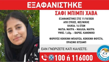 Πρόκειται για την Μπίμπι Χαβά Σαφί τα ίχνη της οποία χάθηκαν στις 14:30 της Κυριακής (11.10.2020), από την περιοχή των Συκεών, στη Θεσσαλονίκη «Το Χαμόγελο του Παιδιού» προέβη σήμερα, 11/10/2020, στη δημοσιοποίηση των στοιχείων της 14χρονης κατόπιν αιτήματος της οικογένειας, καθώς ανησυχούν για την ανήλικη.