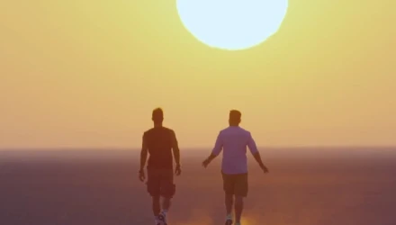 Οι δύο παρουσιαστές εμφανίζονται σε μια έρημο και αναρωτιούνται με χιούμορ αν βαδίζουν προς τη σωστή κατεύθυνση.