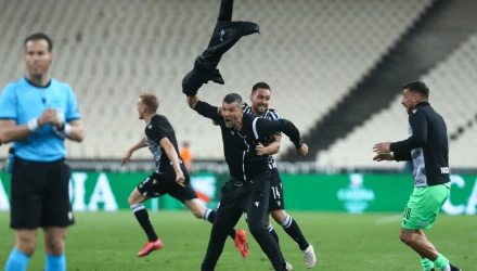 Με τον Τσιρίλο που τον συγκρατεί, πανηγυρίζει την μεγάλη νίκη επί του Ολυμπιακού στο Καραϊσκάκη στα πλέι οφ, με προπονητή τον Σάντος.