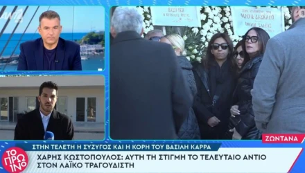 Εκεί είναι η σύζυγος και η κόρη του Βασίλη Καρρά, καθώς τους δύο άνδρες, που έφυγαν με λίγες ημέρες διαφορά από τη ζωή, συνέδεε στενή φιλία. Μάλιστα ο Βασίλης Καρράς είχε βαπτίσει έναν από τους γιους του Χάρη Κωστόπουλου.