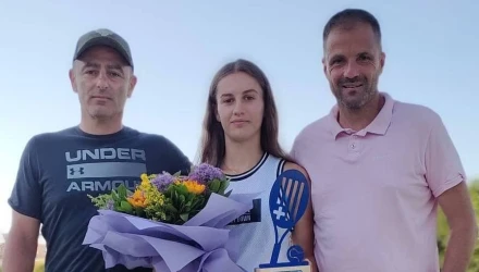 Η 21χρονη Θεσσαλονικιά τενίστρια, η οποία εκροσωπεί τον Α.Ο.Α Σταυρούπολης «ΙΦΙΤΟΣ» μπήκε ως Unseesed (λογο απουσιας 2 ετων από αγώνες λόγω σοβαρού τραυματισμού) στο ταμπλο του φετινού Πανελλήνιου, είχε ενα εξαιρετικό τουρνουά στα γήπεδα του 0.Α Αθηνών. Στην φώτο η νέα πρωταθλήτρια Ελλάδας με τον προπονητή της Μπάμπη Ανεσιάδη (αριστερά) και τον φίλο του Ομίλου και γνωστό ατζέντη Αχιλλέα Χατζηνικολάου.