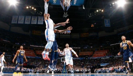 Ο Ράσελ Ουέστμπρουκ έκανε ένα ακόμα τριπλ-νταμπλ με 34 πόντους, 13 ριμπάουντ και 14 ασίστ ενώ είχε σημαντικές βοήθειες από τους Τζορτζ και Ανταμς με 21 και 20 πόντους αντίστοιχα. Για την ομάδα της Γιούτα πρώτος σκόρερ ήταν ο Μίτσελ με 31 πόντους.