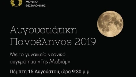 Το Αρχαιολογικό Μουσείο Θεσσαλονίκης σε συνεργασία με τον Σύνδεσμο των Φίλων του και τη Φιλόπτωχο Αδελφότητα Ανδρών Θεσσαλονίκης προσκαλεί το κοινό σε μια συναυλία αφιερωμένη στην Πανσελήνο του Αυγούστου, που φέτος συμπίπτει με τον εορτασμό του Δεκαπενταύγουστου, από το γυναικείο 5μελές νεανικό συγκρότημα «Γης Μαδιάμ».