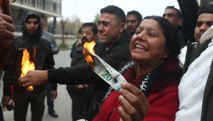 Αρκετοί από αυτούς έβγαλαν χαρτονομίσματα και τα έδειξαν επιδεικτικά, καίγοντας τα, ενώ υπάρχει η παρουσία ισχυρής αστυνομικής δύναμής.