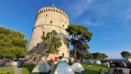 Οι φοιτητές από νωρίς το απόγευμα της Δευτέρας (13/5) έστησαν σκηνές μπροστά το Λευκό Πύργο και δηλώνουν αποφασισμένοι να μείνουν όλη τη νύχτα ως ένδειξη αλληλεγγύης στον Παλαιστινιακό λαό.
