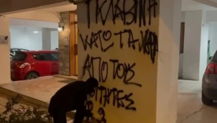 “ΓΚΛΑΒΙΝΗ ΚΑΤΩ ΤΑ ΧΕΡΙΑ ΑΠΟ ΤΟΥΣ ΦΟΙΤΗΤΕΣ”, έγραψαν με σπρέι τα μέλη του Ρουβίκωνα στην πυλωτή της πολυκατοικία ενώ πέταξαν και τρικάκια.