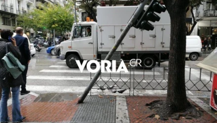 Ένας φωτεινός σηματοδότης στην οδό Τσιμισκή στο ύψος της Καρόλου Ντηλ αποκολλήθηκε από το πεζοδρόμιο και «ξάπλωσε» -ευτυχώς- σε δέντρο που βρίσκεται στο σημείο.