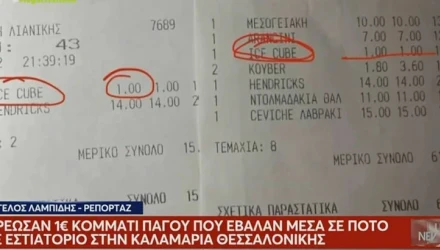Συγκεκριμένα, το περιστατικό έγινε σε εστιατόριο στην περιοχή της Καλαμαριάς, σύμφωνα με το Mega, με την απόδειξη να γράφει ένα ευρώ και δίπλα την αιτιολογία «Ice Cube», δηλαδή κύβος πάγου.