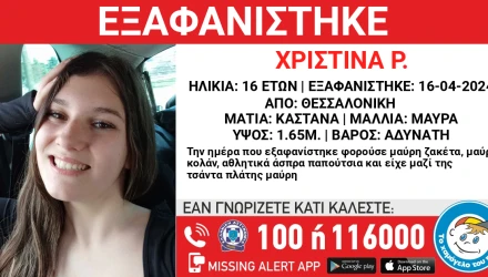 Σύμφωνα με ανακοίνωση από το «Χαμόγελο του Παιδιού», την Τρίτη 16 Απριλίου 2024, πρωινές ώρες, εξαφανίστηκε από χώρο παιδικής προστασίας στη Θεσσαλονίκη, η Χριστίνα Ρ. 16 ετών. «Το Χαμόγελο του Παιδιού» ενημερώθηκε για την εξαφάνιση της ανήλικης και προχώρησε στην δημοσιοποίηση των στοιχείων της, καθώς ενδέχεται να συντρέχουν λόγοι που θέτουν τη ζωή της σε κίνδυνο.