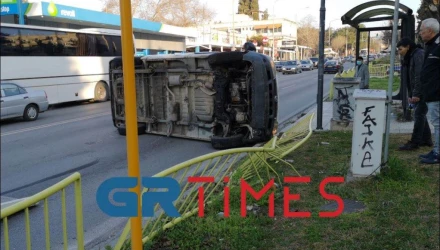 ΙΧ τούμπαρε μετά από σύγκρουση με άλλο όχημα, στη συμβολή των οδών Αγίων Πάντων και Κολωνιάρη, στη Θεσσαλονίκη.