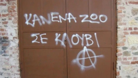 «Κανένα ζώο σε κλουβί», έγραψαν στην είσοδο του καταστήματος σύμφωνα με την ανάρτηση που έκαναν σε σελίδα του αντιεξουσιαστικού χώρου. Παράλληλα, πραγματοποίησαν παρεμβάσεις και σε άλλα καταστήματα στο κέντρο της πόλης , που σύμφωνα με τους ίδιους, είναι «χορηγοί γνωστού τηλεσκουπιδιού, που παρέχει θέαμα χρησιμοποιώντας ζώα».
