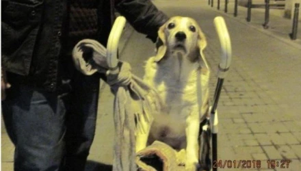 Όπως ανέφερε ο ιδιοκτήτης στο zoosos.gr, βγάζει τη σκυλίτσα του βόλτα, εδώ και δύο χρόνια και τη βοηθάει να σταθεί για να ουρήσει κρατώντας την με ένα κομμάτι ύφασμα σαν κασκόλ, το οποίο περνάει κάτω από την κοιλιά της προκειμένου να στηρίζεται στα πίσω πόδια της και να μην τραυματίζεται.