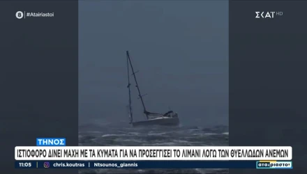 Στο λιμάνι της Τήνου κατάφερε να «δέσει», τελικά, με ασφάλεια το ιστιοφόρο, που έδινε μάχη με τα κύματα για να αποβιβαστούν οι επιβαίνοντες.
